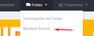1. Clique na aba "Fretes" e depois clique em “Madeira Envios”