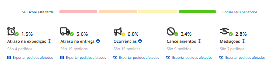 Mantenha sua operação sempre em alto nível! Ela é fundamental para o sucesso da sua loja e para continuarmos oferecendo a melhor experiência aos nossos clientes. Acompanhe seus indicadores de score regularmente para monitorar a saúde da sua operação em nosso marketplace e aproveite ao máximo os benefícios exclusivos da Faixa Verde para impulsionar suas vendas!