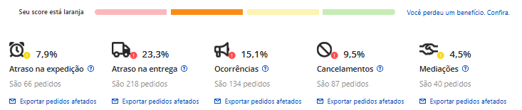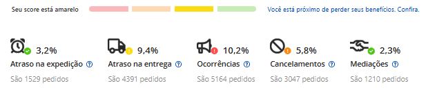 - O que significa: Sua loja possui pontos de atenção que precisam ser ajustados para evitar a perda dos benefícios da Faixa Verde. Seu score está entre 2,01 e 3,50.