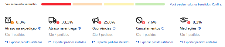 - O que significa: Sua loja demonstra uma operação crítica, caracterizada por problemas que afetam significativamente a experiência do cliente, a confiança dos compradores e a reputação da sua loja na plataforma. Seu score está entre 0 e 0,5.