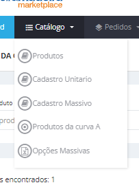 Na aba catálogo, você consegue cadastrar, atualizar ou corrigir seus produtos, fazer cadastro unitário ou massivo, verificar produtos da curva A e fazer ações massivas.