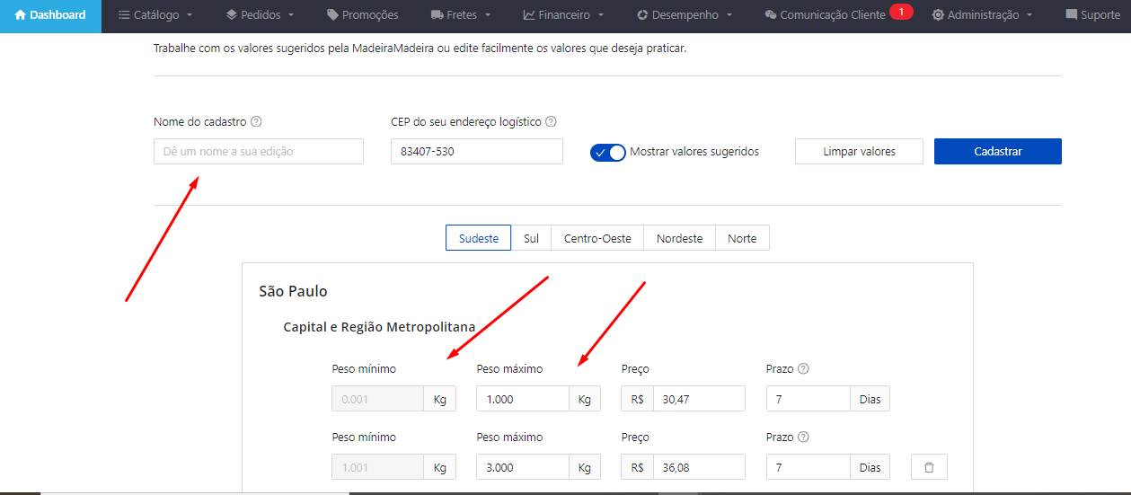 Aqui o próprio portal irá sugerir valores e prazos conforme o seu CEP logístico, confira se está de acordo com todos os valores, caso contrário você precisará clicar no botão limpar valores e preencher de acordo com a sua operação.