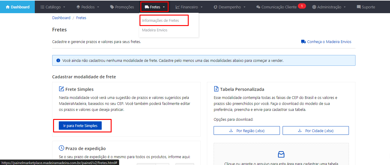 No Portal Marketplace acesse a Aba Fretes > Informações de Fretes