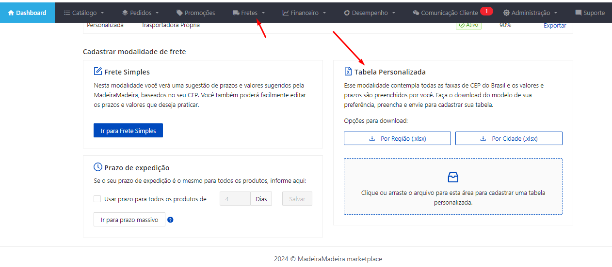 Após cadastrado a nova modalidade de frete seja diretamente no portal ou via planilha, as modalidades serão exibidas na aba de Fretes, conforme a forma que foi cadastrada e também nomeada, facilitando assim o vínculo do seu produto com a operação que ele precise ser cotado.