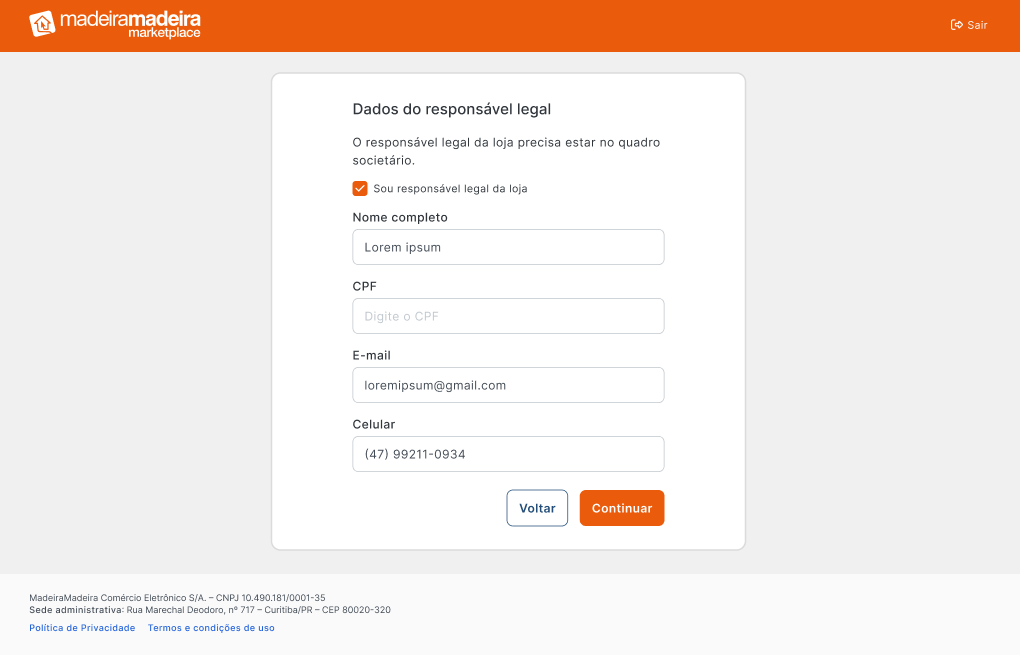 - Durante o cadastro, na tela “Dados do responsável legal”, selecione a opção: ✔ “Sou responsável legal da loja”