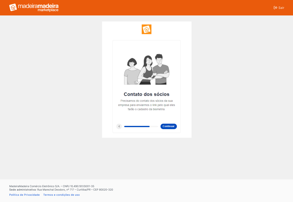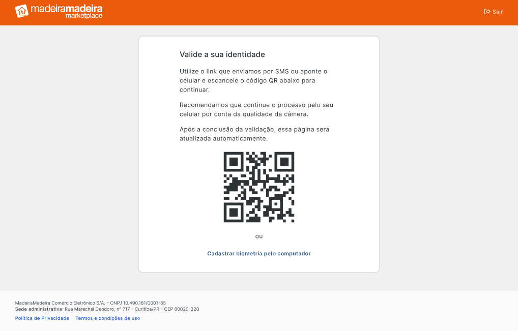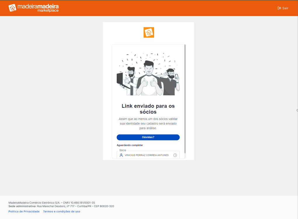 - Após essa etapa, o link para realização da biometria será enviado via SMS ou e-mail para o contato do sócio informado.