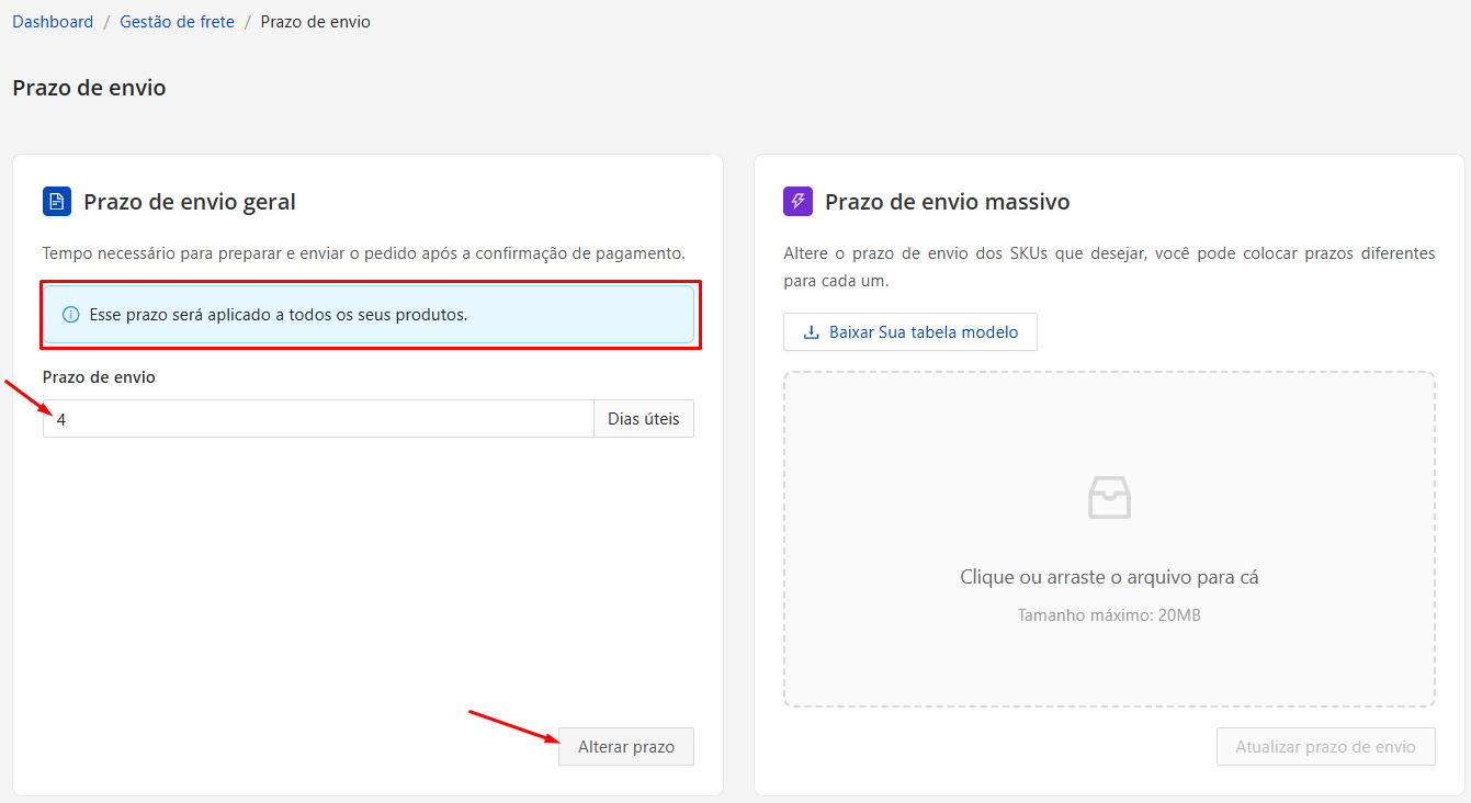 l Se quiser definir o mesmo prazo de expedição para todos os seus produtos, é só colocar o número de dias úteis que quer no "Prazo de envio" e clicar em "Alterar prazo", esse prazo vai ser definido para todos seus produtos.