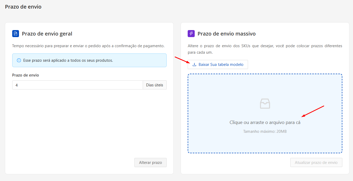 l Salve a planilha e clique em "Clique ou arraste o arquivo pra cá", selecione a planilha editada, e clique em "Atualizar prazo de envio"